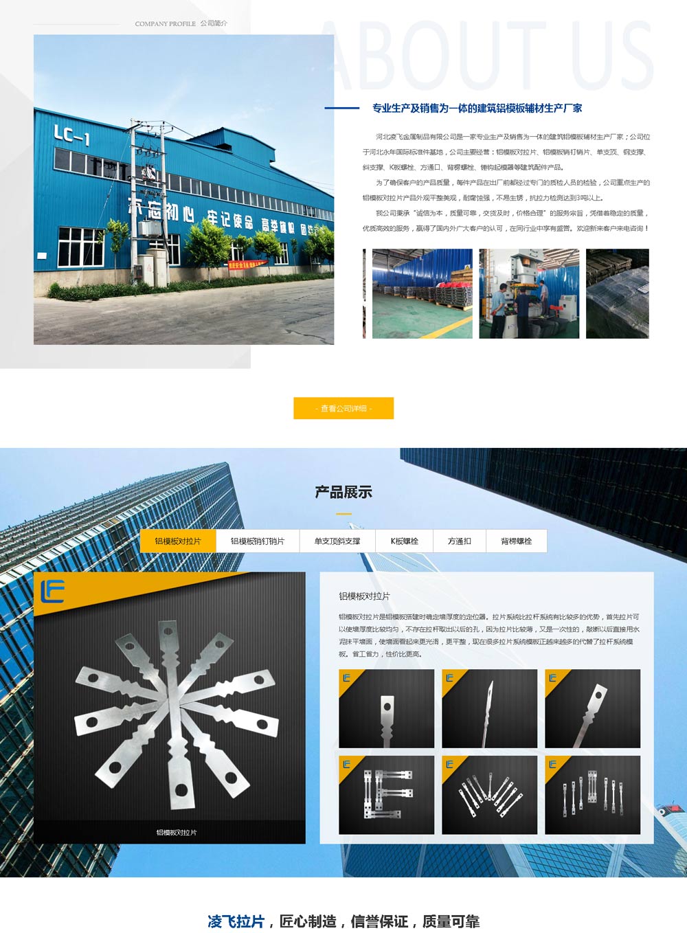 新聞?wù)?河北凌飛金屬制品有限公司是一家專業(yè)生產(chǎn)及銷(xiāo)售為一體的建筑鋁模板輔材生產(chǎn)廠家;公司位于河北永年國(guó)際標(biāo)準(zhǔn)件基地,公司主要經(jīng)營(yíng):鋁模板對(duì)拉片、鋁模板銷(xiāo)釘銷(xiāo)片、單支頂、鋼支撐、斜支撐、K板螺栓、方通口、背楞螺栓、錘鉤起模器等建筑配件產(chǎn)品。